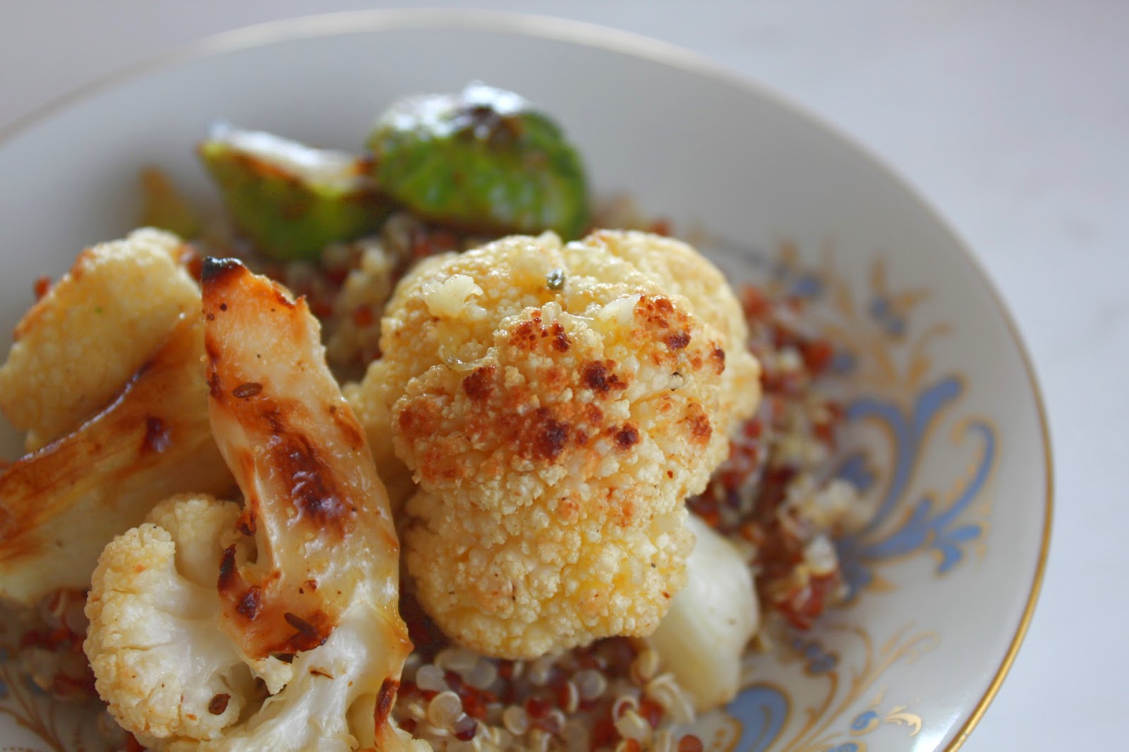 Preheat the oven to 450 degrees. Break the cauliflower into florets. Toss the cauliflower and brussel sprouts with the olive oil and cumin seeds; spread on a sheet pan. Roast in the oven until the florets are slightly charred and tender (I like to keep a bit of crunch to these rather than cook until fully soft, so cook to your preference).